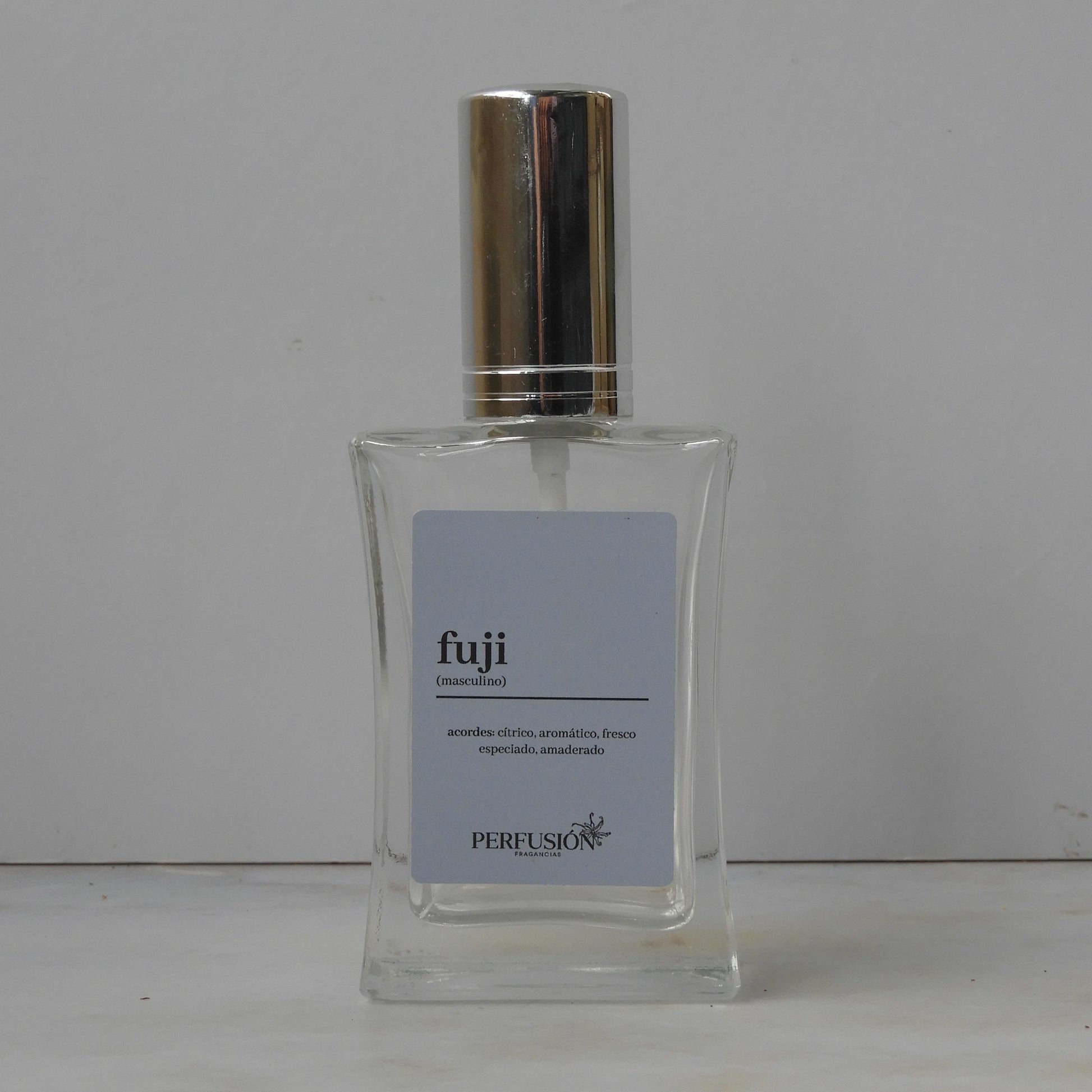 Frasco de vidrio con atomizador plateado, presentado en una caja ilustrada. El empaque cuenta con protección de papel y caucho natural, evitando el uso de plásticos. Está disponible en presentaciones de 3, 30, 50 y 100 ml.